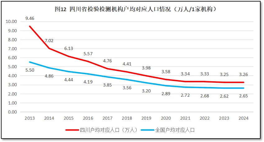 再来看四川地区检验检测机构户均对应服务的人口情况。2024年末,四川省常住人口8364万人,检验检测机构户均服务人口3.26万人,比全国平均数2.65万人高出6100人,排名全国第5位,较2023年度排名提升1位。相对于四川省较大的人口数量,当地的检验检测机构数量并不算多。过去12年,四川省检验检测机构户均对应的人口数量与全国的情况进行比较,如图12所示。