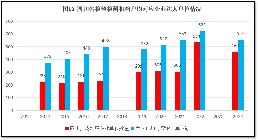 由图13可见,四川省检验检测机构户均对应的企业法人单位数量逐年增高,但一直比全国平均水平低,2024年度与全国平均水平的差距略微减少。这说明四川地区检验检测机构数量相对较多,由于区域经济仍处于不太发达和不平衡的状态中,企业数量则相对不足,对检验检测机构来说“僧多粥少”,竞争预期较为激烈,市场可拓展空间有限。2024年度户均对应企业法人单位数量有所上升,可以适当缓解四川地区检验检测市场竞争压力。
