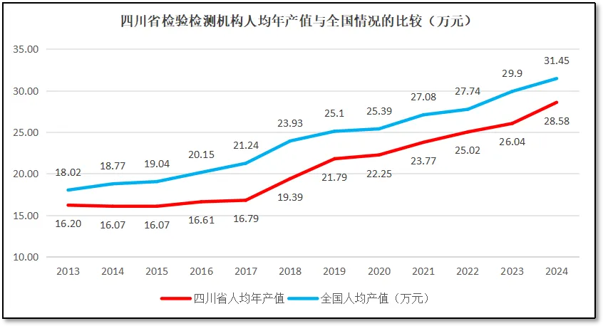 由图17可见,过去12年,四川省检验检测机构人均年产值持续保持增长,2024年达到28.58万元,是2013年的1.76倍。从增长率来看,在2018年出现一个增长峰值,年度同比增幅达到15.49%,其他年份在10%以内波动。不过,由于四川省检验检测机构人均年产值的起点低,尽管过去12年四川省检验检测机构人均年产值年均增幅达到5.41%,但至今仍未达到检验检测行业的“温饱线”。2024年,四川省检验检测机构人均年产值增幅较大,有望在未来两三年内突破温饱线,甚至超过全国平均数。