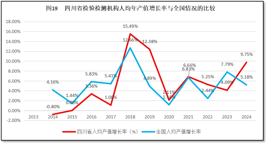 四川省检验检测机构人均年产值增长率与全国人均年产值增长率的比较,如图19所示。