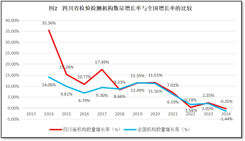 四川省检验检测机构数量增长率与全国检验检测机构数量的增长率进行比较,结果如图2所示。